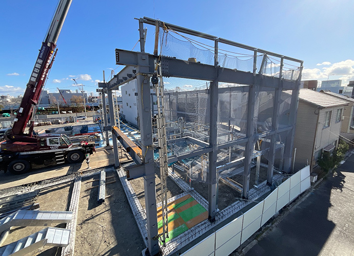 耐震補強工事に合わせて外装と看板の改修を行いました。写真は、改修工事の様子です。工事中ですが店舗は営業しています。